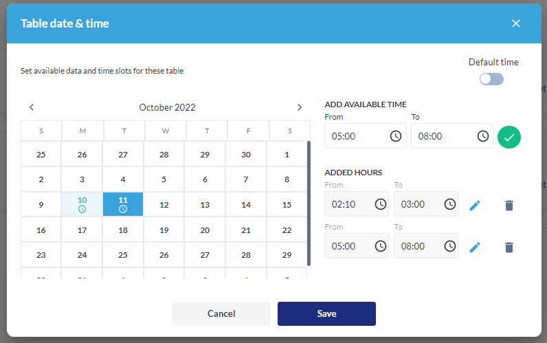 In case you want to limit the time on a particular table or add additional time, you need to unclick Default time, select date, and indicate additional hours