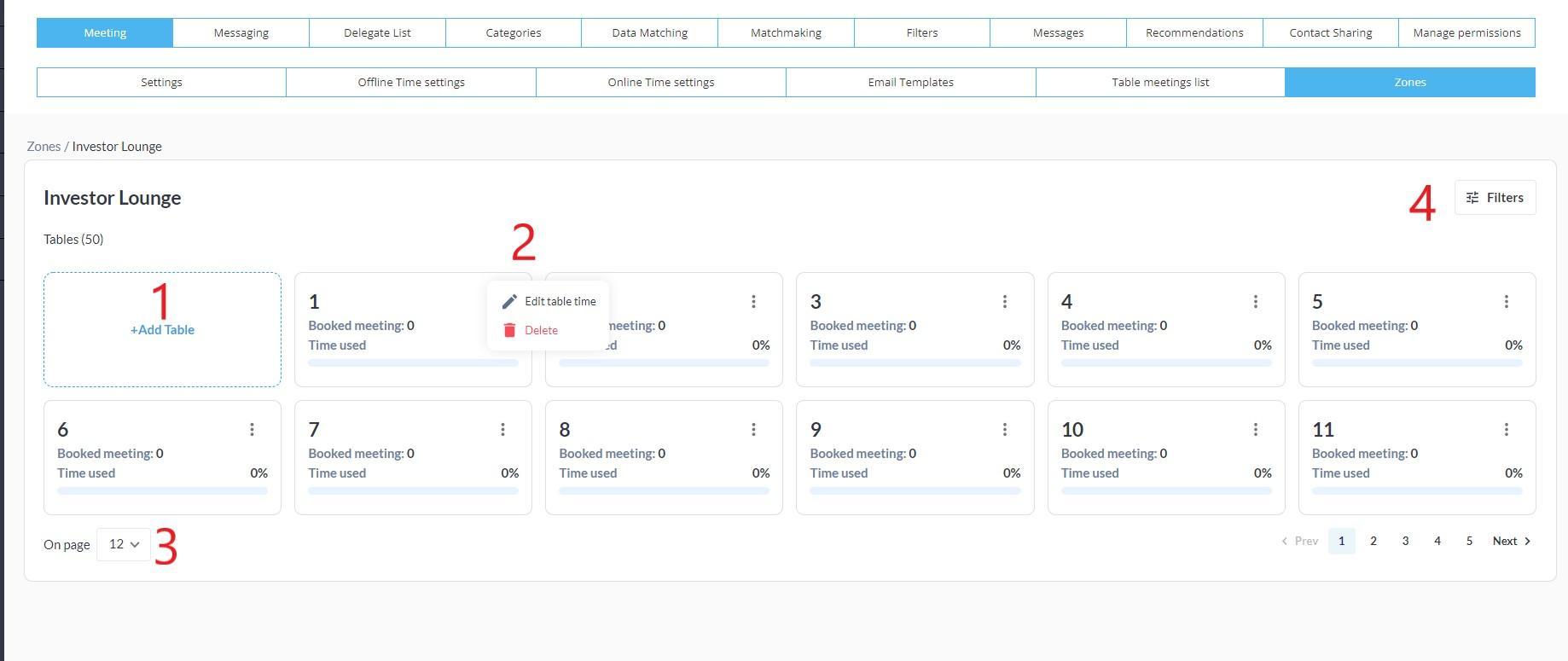 The Tab “Zones“ is available on the Meetings page (Networking & Matchmaking > Meetings) when the toggle “Table meetings“ in module management is turned on.