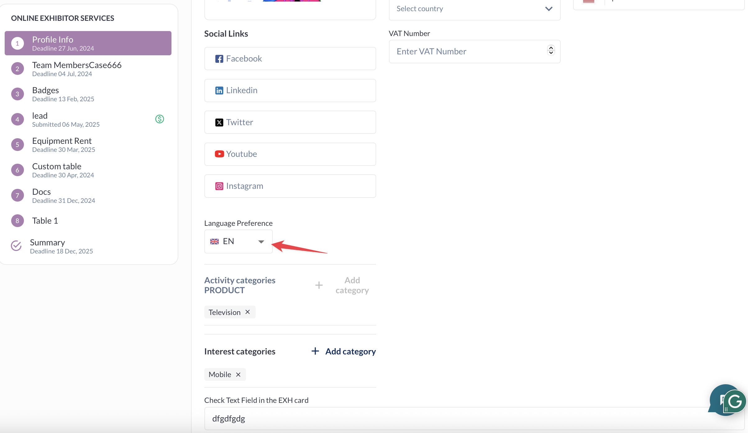 Please note- at the bottom of the page, there is a language selector where the exhibitor can choose the language in which he prefers to receive emails.