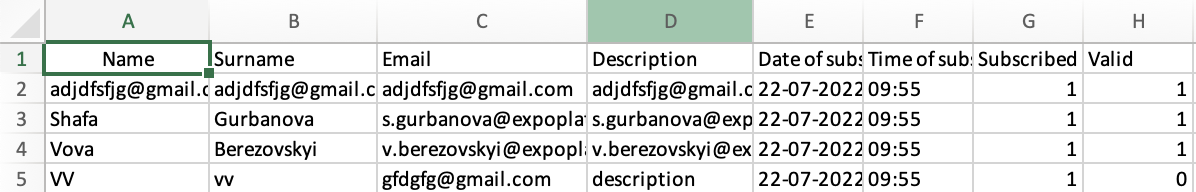 Required fields in .xls file are Name, Surname, and Email, other fields like- Description, Date of subscribe, Time of subscribe, Subscribed, Valid - get generated automatically after upload.