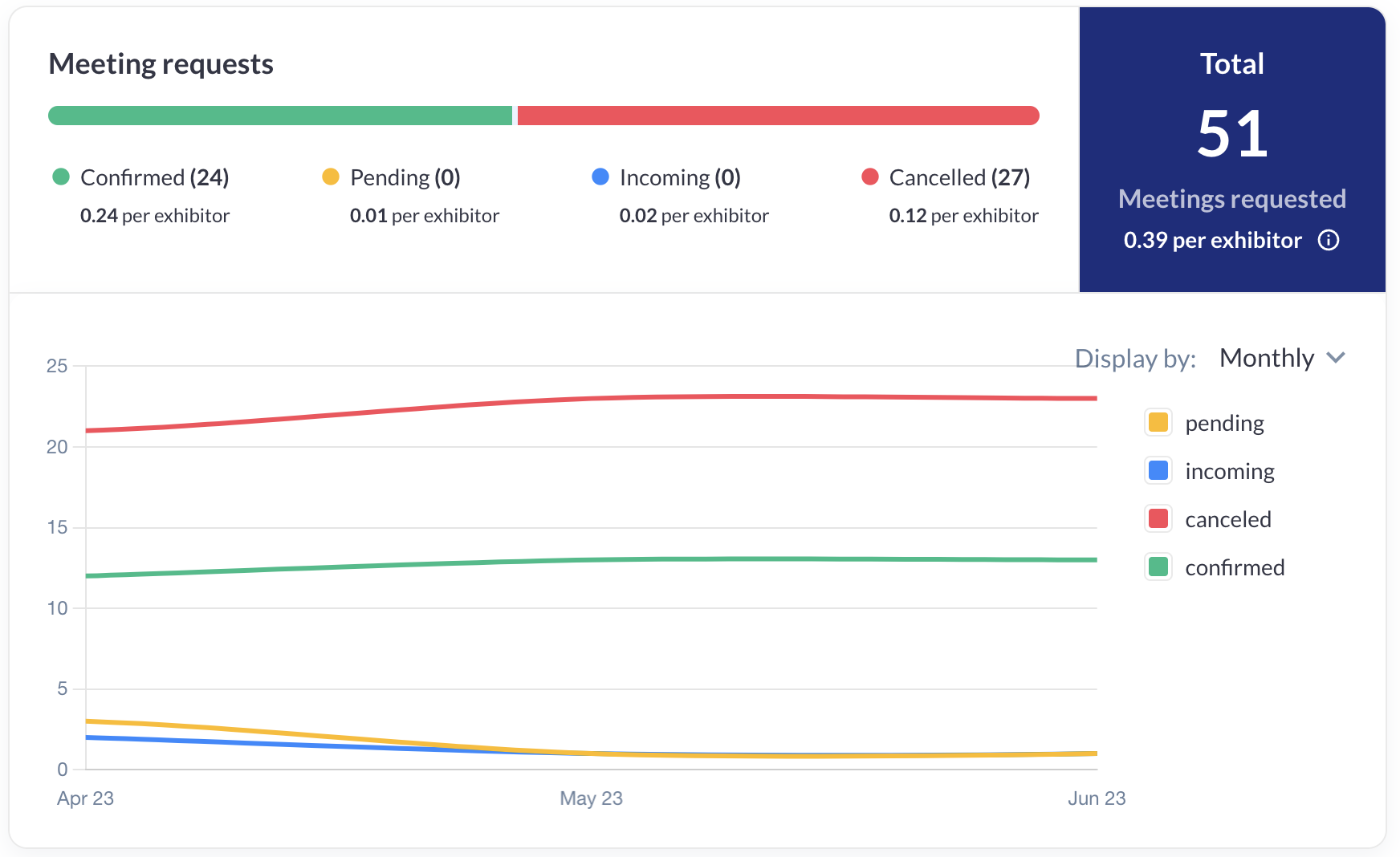 Features a dynamic graph showing the progression of total meeting requests over time. The data can be displayed by days, weeks, or months, allowing exhibitors to track trends and identify peak periods of engagement.