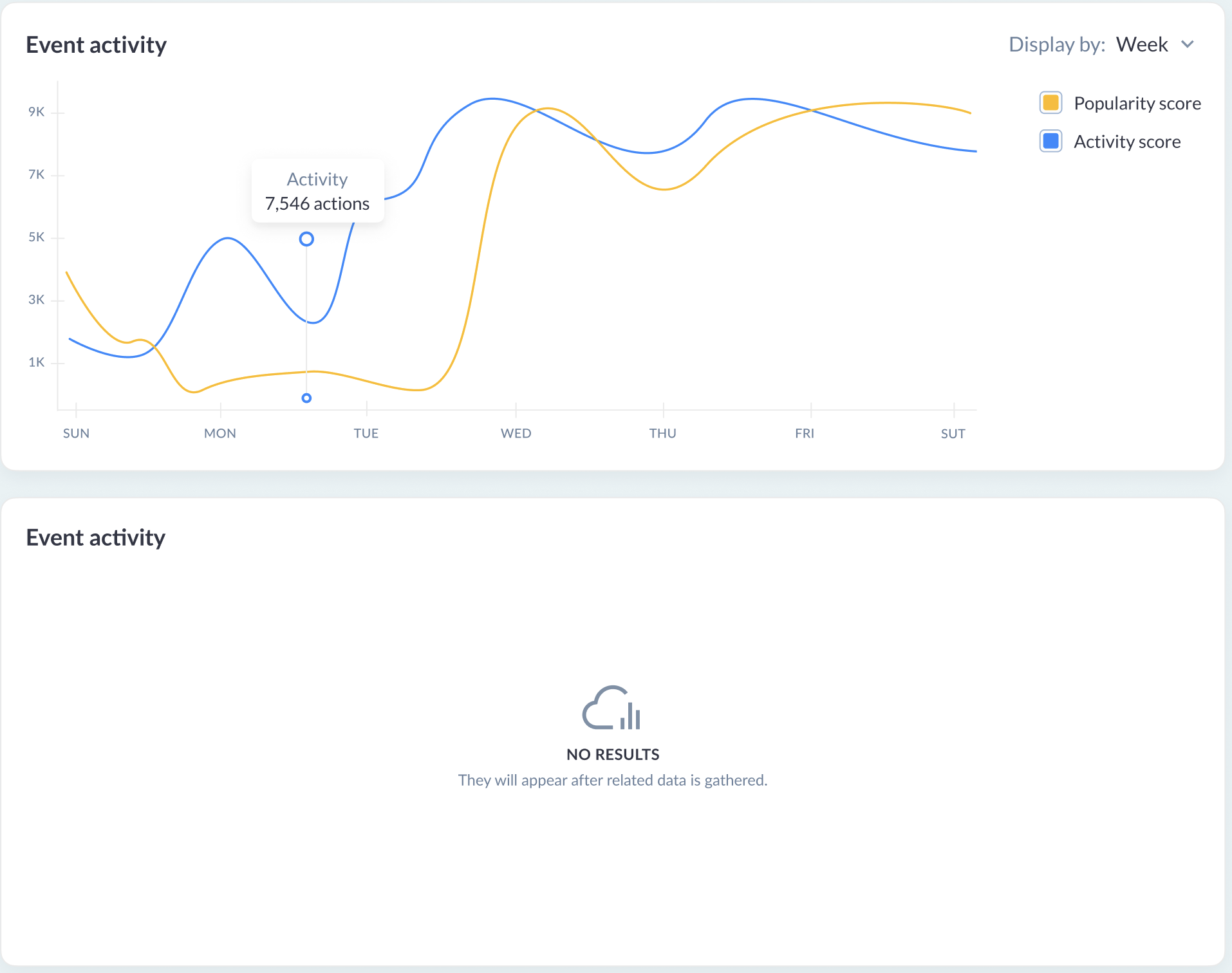 Yes, we have the ‘Events Activity’ and ‘Popular content’ widgets showing this information as shown in the example below.