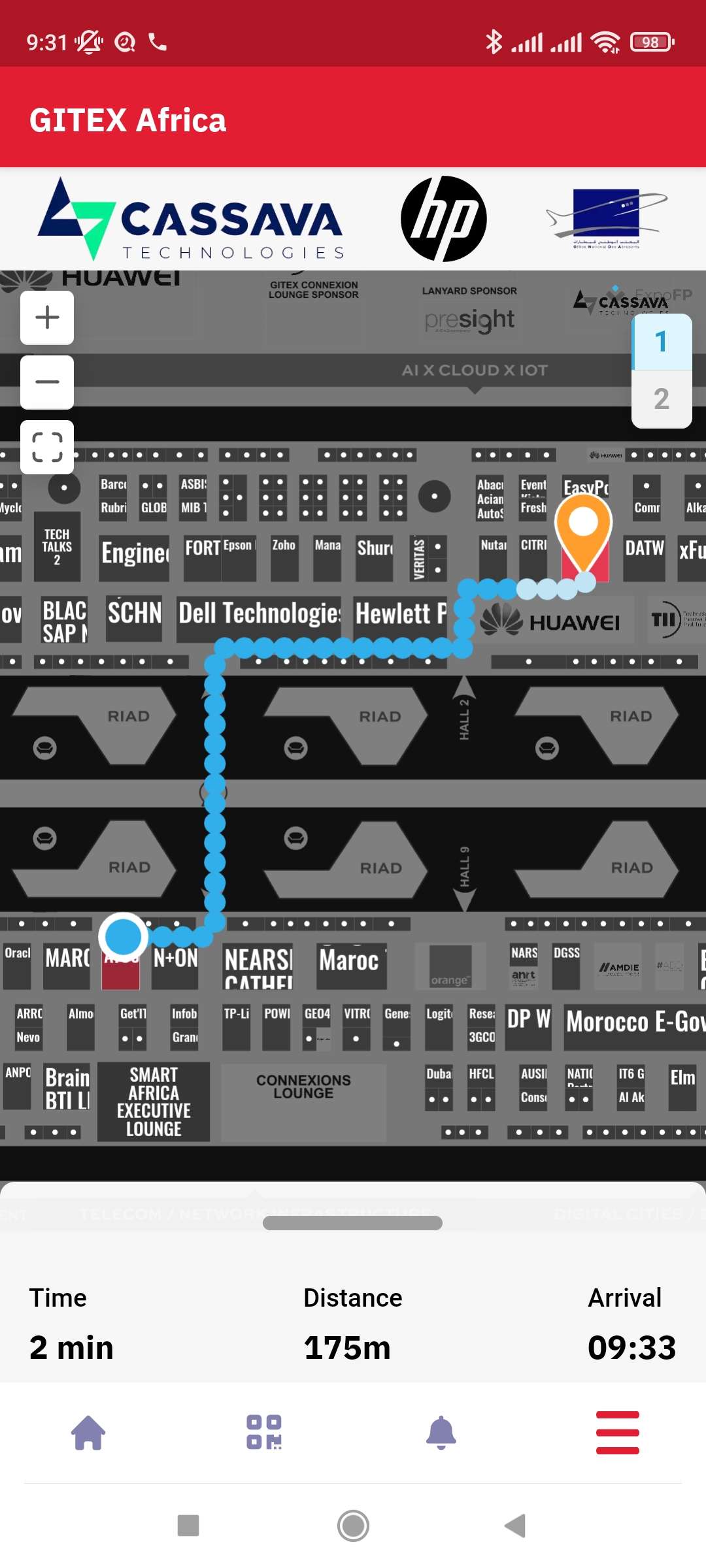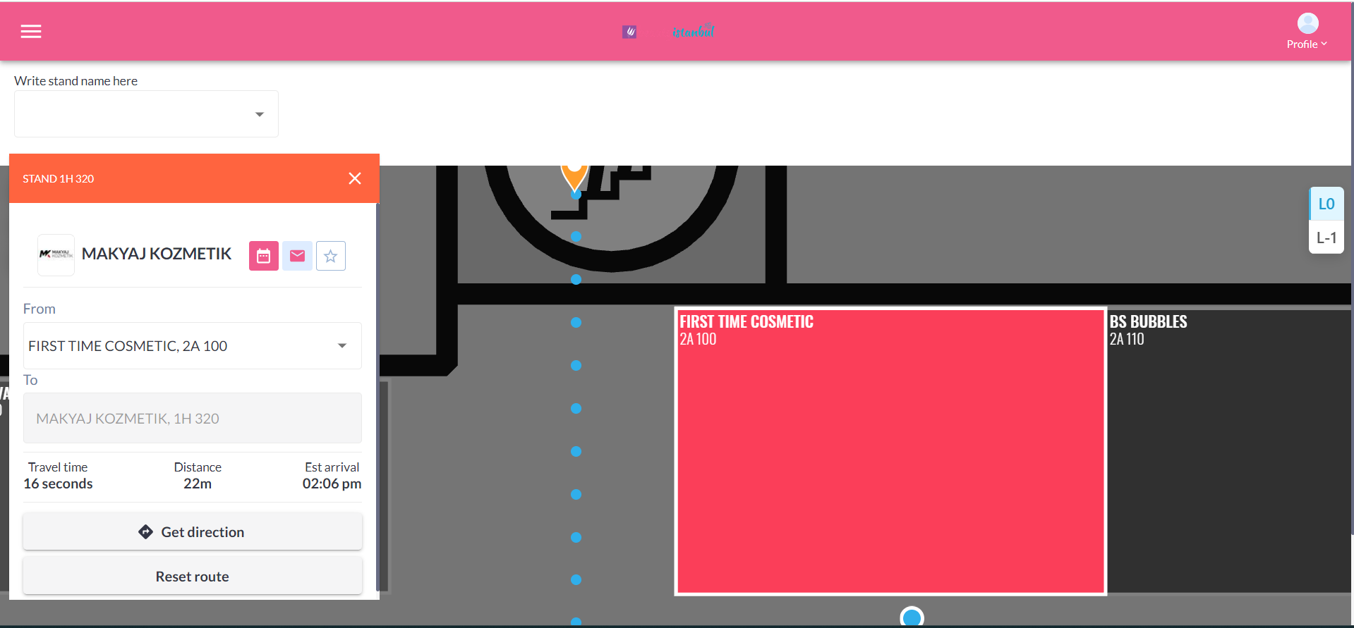 If the user clicks on get directions between 2 stands, it shows the travel time, distance between the 2 stands and the estimated arrival time There isn’t search function for ‘get direction’ pop up. To determine your current location on the floorplan, you'll need to physically indicate your position by clicking on the plan itself. ![]() |
