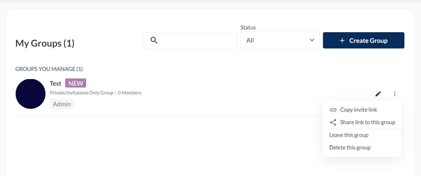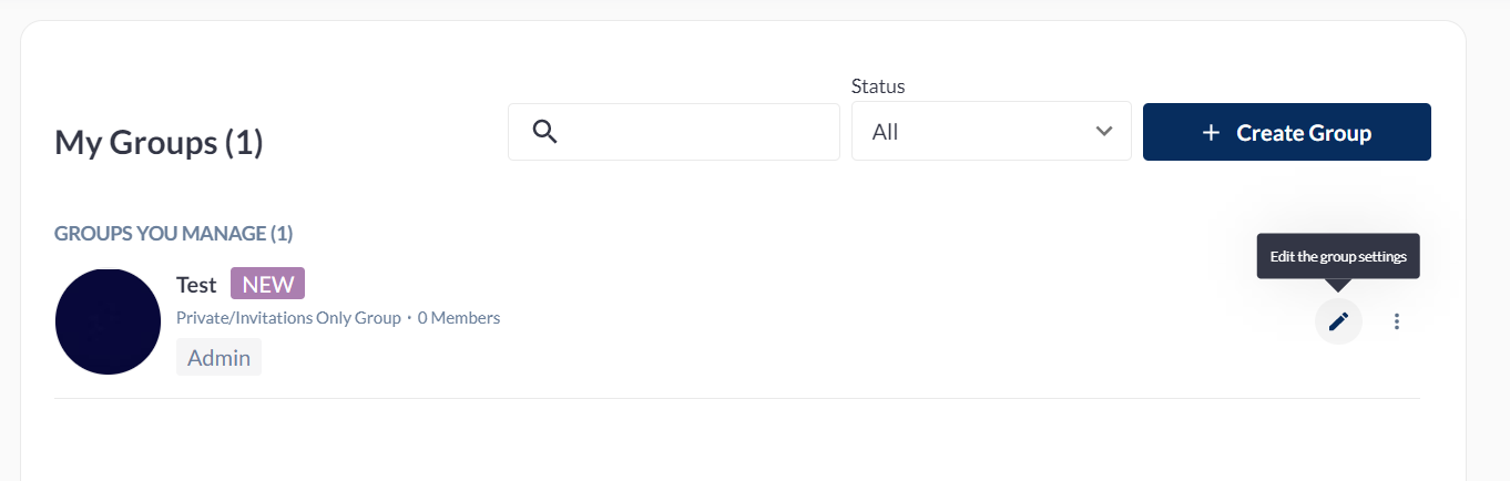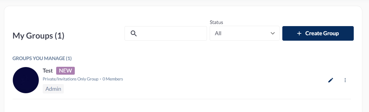 The created group will appear in the Community Groups page and on the My Groups page of the admin who created it. Once a Group is created, the admin has the option to EDIT it by clicking on the pencil icon.