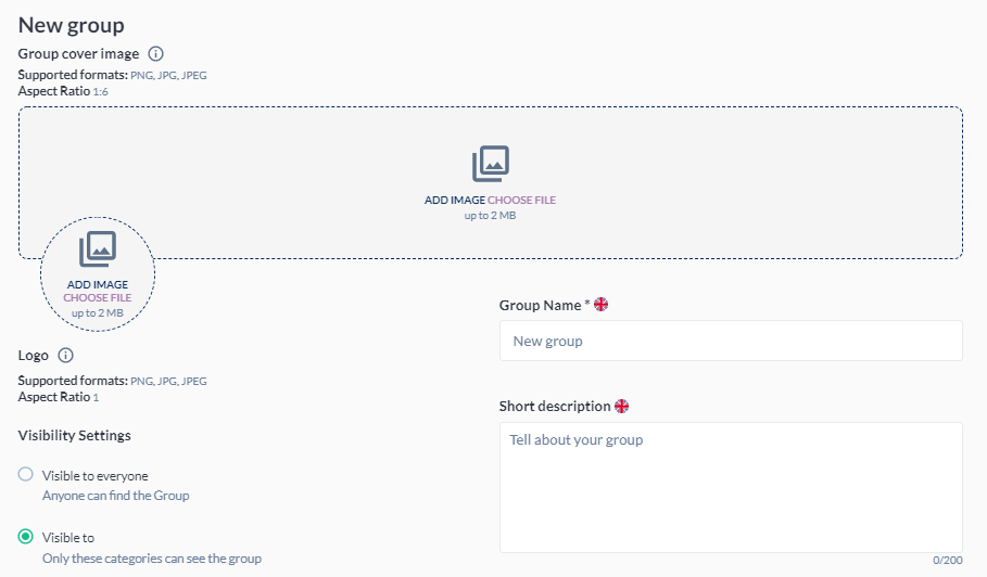 Clicking “CREATE GROUP” button opens a creation page which contains: