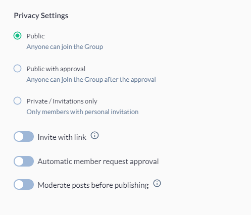 c) Public/Invitation only: Only community members who receive a personal invitation can join this groupInvite with link: Allow people to invite others to this group with a link. Anyone with this link can see the group’s About info and request to join.