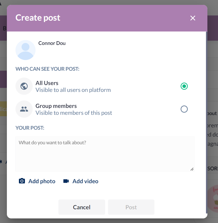 When the user clicks on “start a post” a popup page is displayed where the user can choose to whom he wants this post to be visible, and enter the text of the post along with a photo/video.
