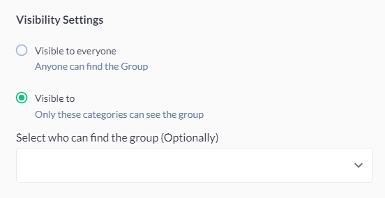 b) Visible to (only these categories): choosing this option will let you choose specific categories from the “select who can find the group “drop down section.