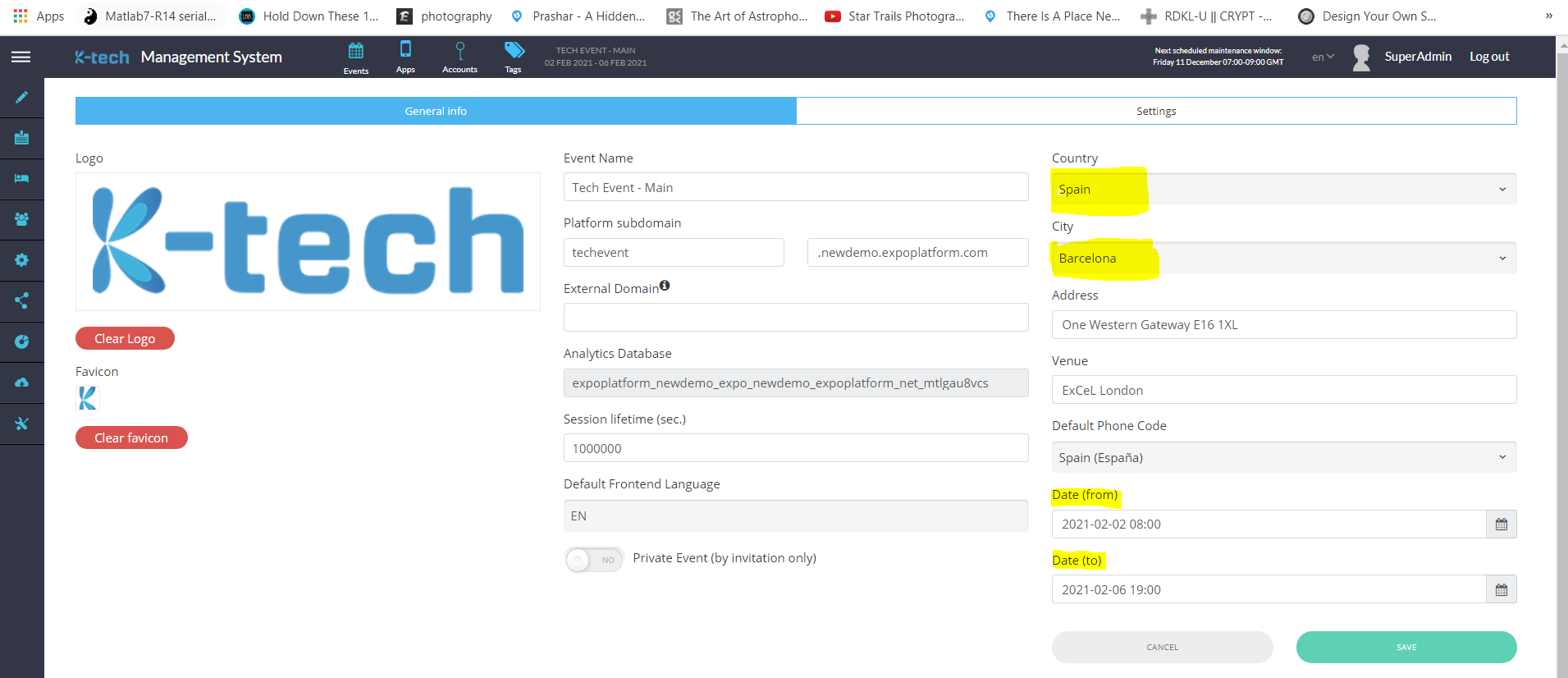 Additionally, mention the default phone code. The date (from & to) for your event.