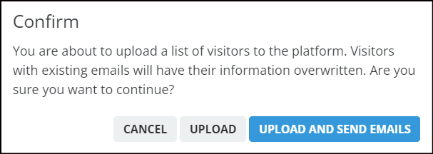 Now there will be a dialogue box with the option to simply upload the file or upload and send emails if you choose the latter then after the upload, the email will be sent to all the visitors informing them about their registration in the event and along with their credentials.