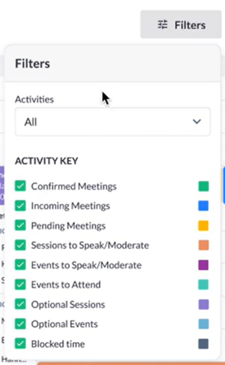 Every item in the activity key has a checkbox. By default all items are checked- that means that all available event types are shown in the team member’s schedule. When the exhibitor unchecks any item, schedule items of that unchecked type disappear from the filtered schedule.