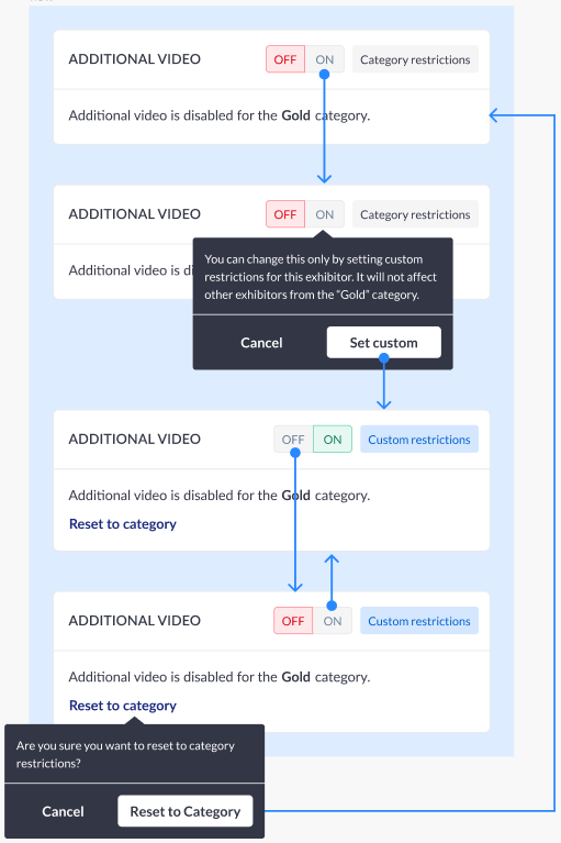 ![]() | No respective setting on category level. Setting on exhibitor level is not handled from category and the only possible restriction source is Custom + no way to switch it to category.