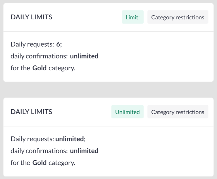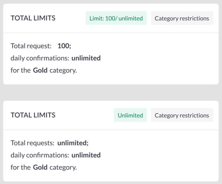 ![]() ![]() | Settings in blocks “Online meetings“ and “Onsite meetings“ don’t have ON/OFF switch, their restriction resource is always Category and can’t be changed. Limit indicator can contain value: