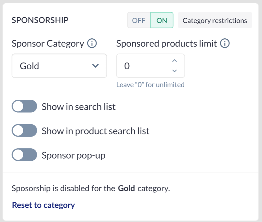 ![]() ![]() | “Sponsor category” and “Sponsored products limit“ fields are not available in a category settings pop-up. Displayment of settings in the block depends on combinations: