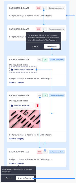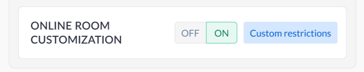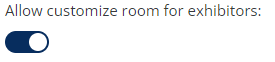 ![]() ![]() | “Allow customize room for exhibitors“ setting turns on for all exhibitors globally, with no controll on category level, but with control on exhibitor level. This setting to be shown on Exhibitor page only when “Allow customize room for exhibitors“ setting is turned on globally. Restriction source indicator is always Custom. |
