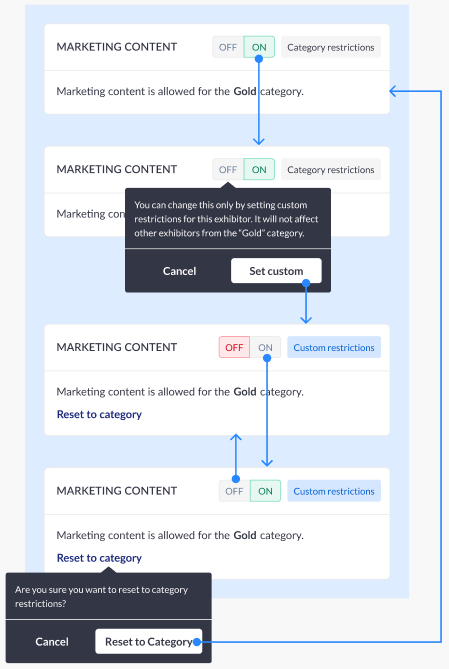 When block is set to the category and user clicks the switch, an interactive pop-up with text “You can change this only by setting custom restrictions for this exhibitor. It will not affect other exhibitors from the “XXXX” category.“ and buttons “Cancel“ and “Set custom“ appears.