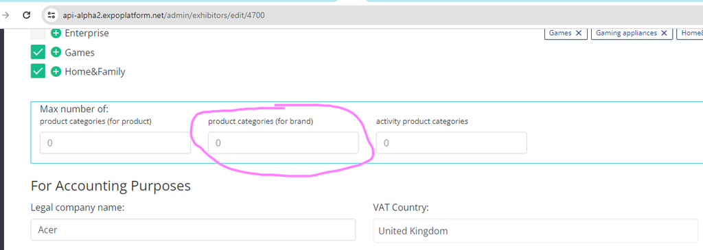 Exhibitor category setting