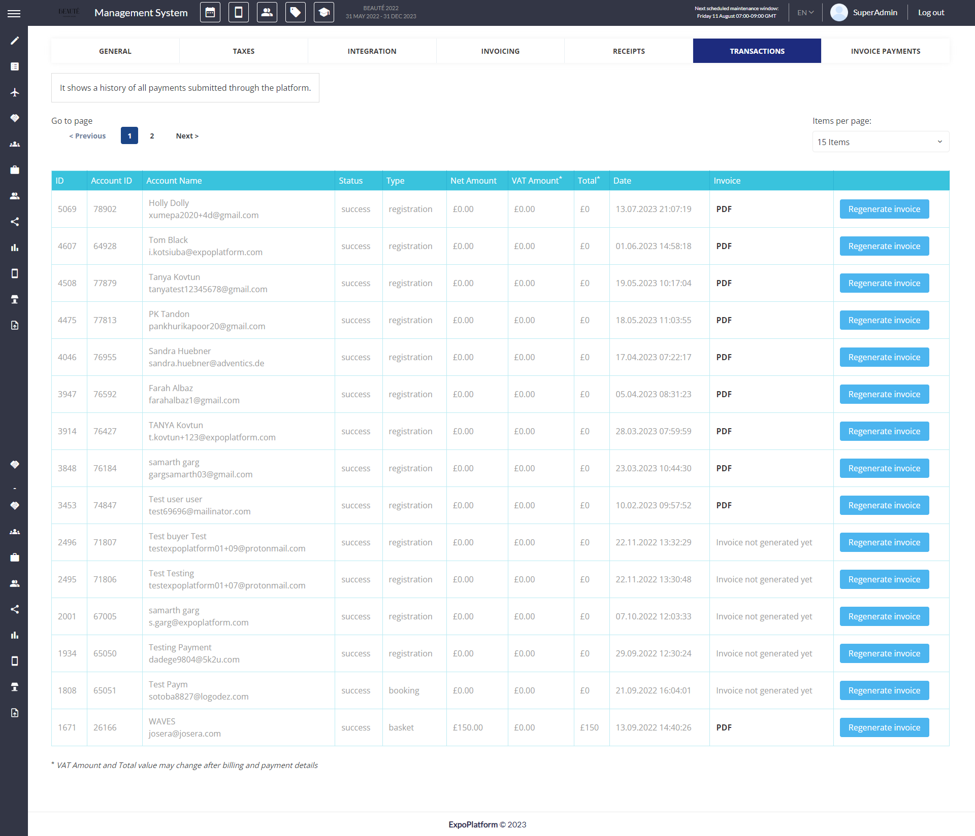 Invoice - for downloading the invoice in PDF format. Sometimes there's a note in this column saying Invoice not generated yet. The look of the invoice file is set up here.