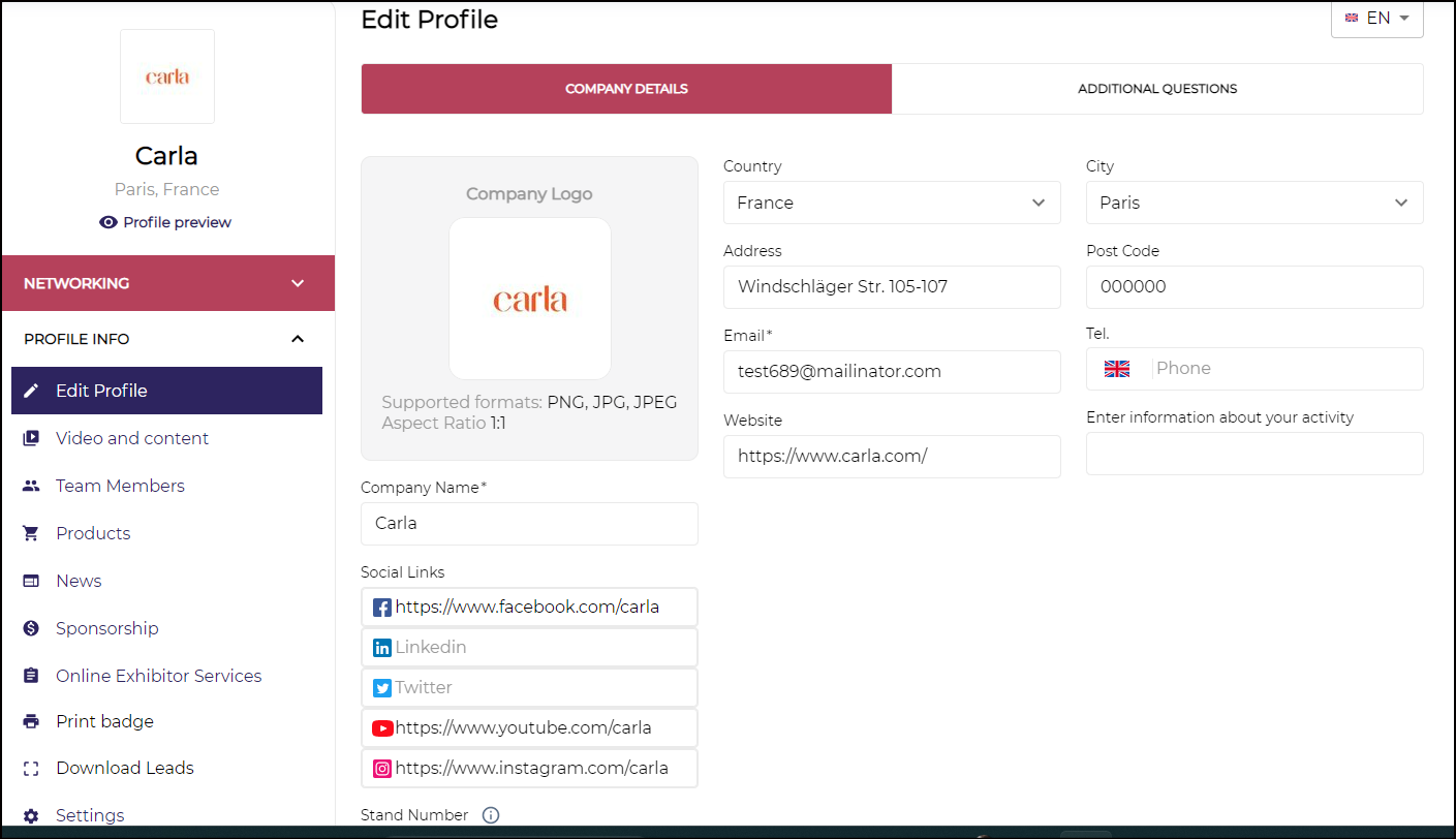 a) Edit Profile → Here exhibitors can add general info about their company, can add a company logo and other details asked by the organizer