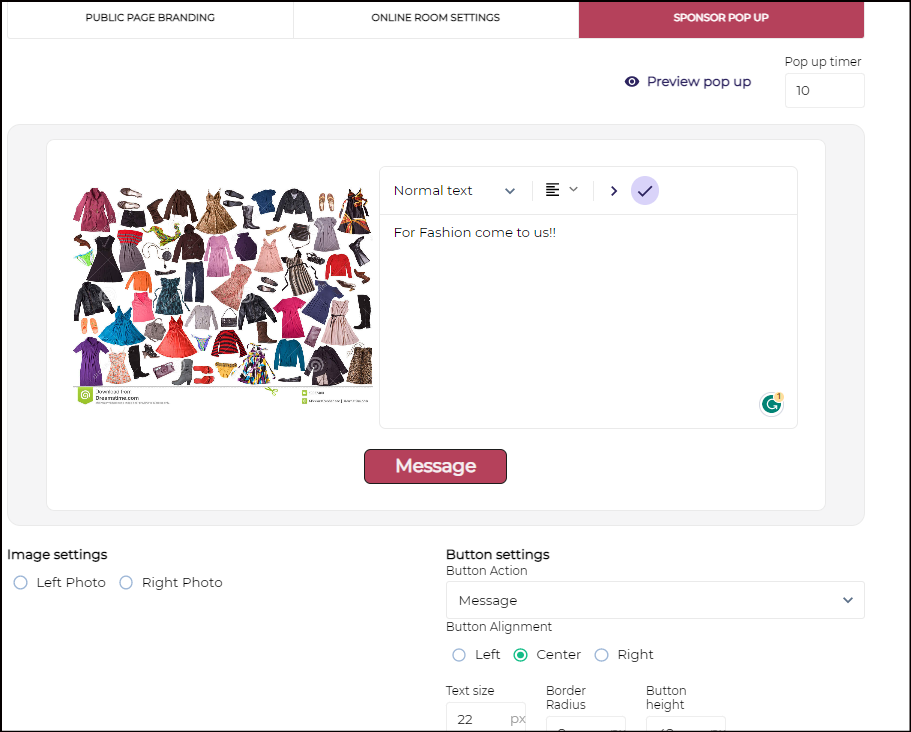 ii) Sponsor- Pop Up: you can customize all the sponsor pop up settings. On saving this, a sponsor pop up would get displayed when someone opens your page.
