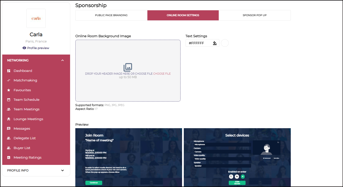 iii)Online Room Settings → One can edit the background Image and choose the text colour here. This option pops up when the particular exhibitor has the functionality to customize Online Rooms