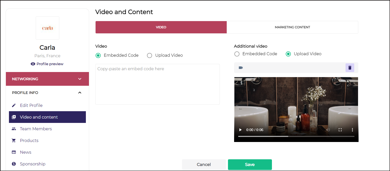 b) Video & Marketing Content: This section allows the exhibitor to add Video & Marketing content of their company. Using this tab exhibitors can upload files such as press releases, brochures, and price lists. Exhibitors can also upload marketing & sales content to boost your profile. If they want them to be displayed in a certain order in their profile, then they need to upload them in that respective order. These documents will be available and can be downloaded by the users browsing the exhibitor’s profile.