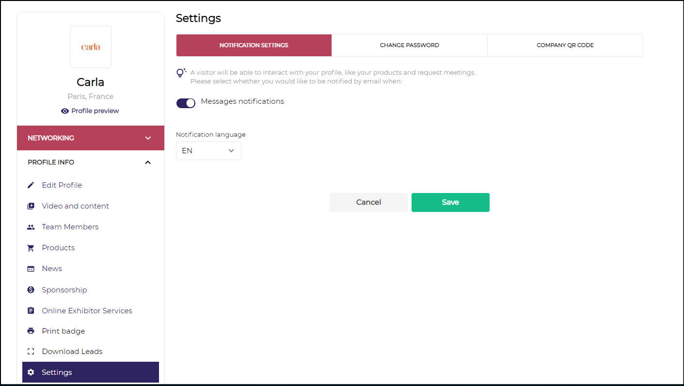 g) Notification Settings → This section help the exhibitor to set if they want to receive meeting or messaging request from the visitor, they can also set the language preference for receiving all kinds of notification in case of multi-lingual event and can download their company QR as well