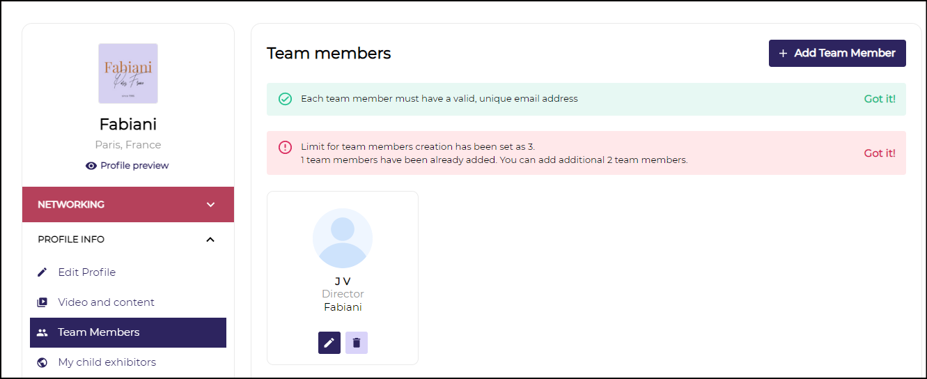 c) Managing Team Members → Exhibitors can add/edit/modify the team member from this section.
