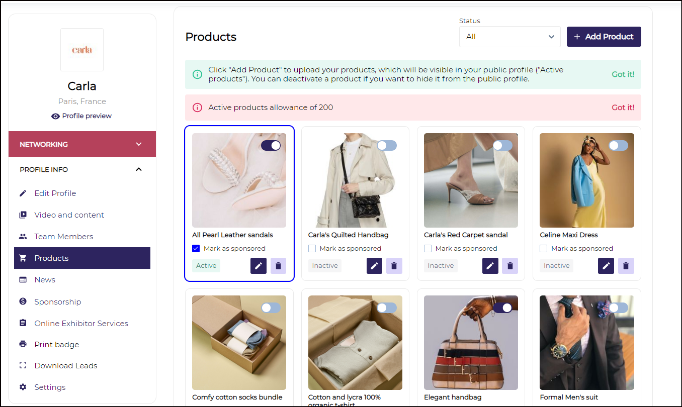 d) Product: This section allows the exhibitor to add the product catalogue and make it available to the end user. They can mark their product as Active or Inactive also they have the option to mark any of their products as sponsored and they will be visible with a distinct frame on the product page.