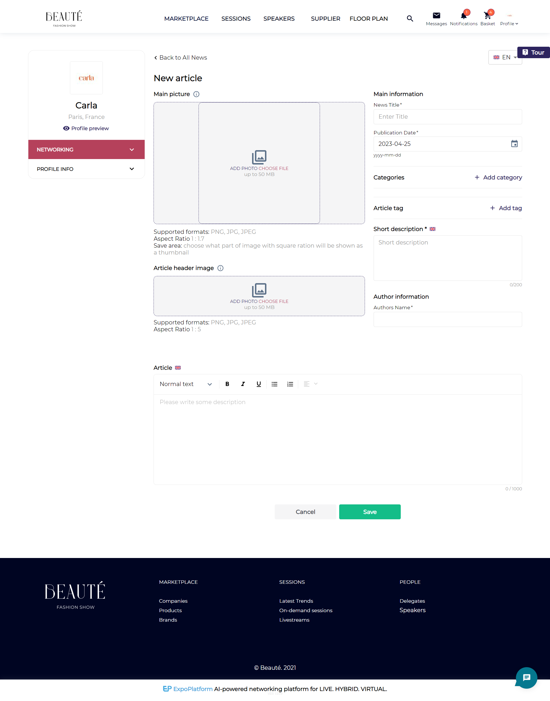 e) Exhibitor News: This section allows the exhibitors to add news articles for the event website blog page, once the article is approved by the organizer it gets published on the News Page.