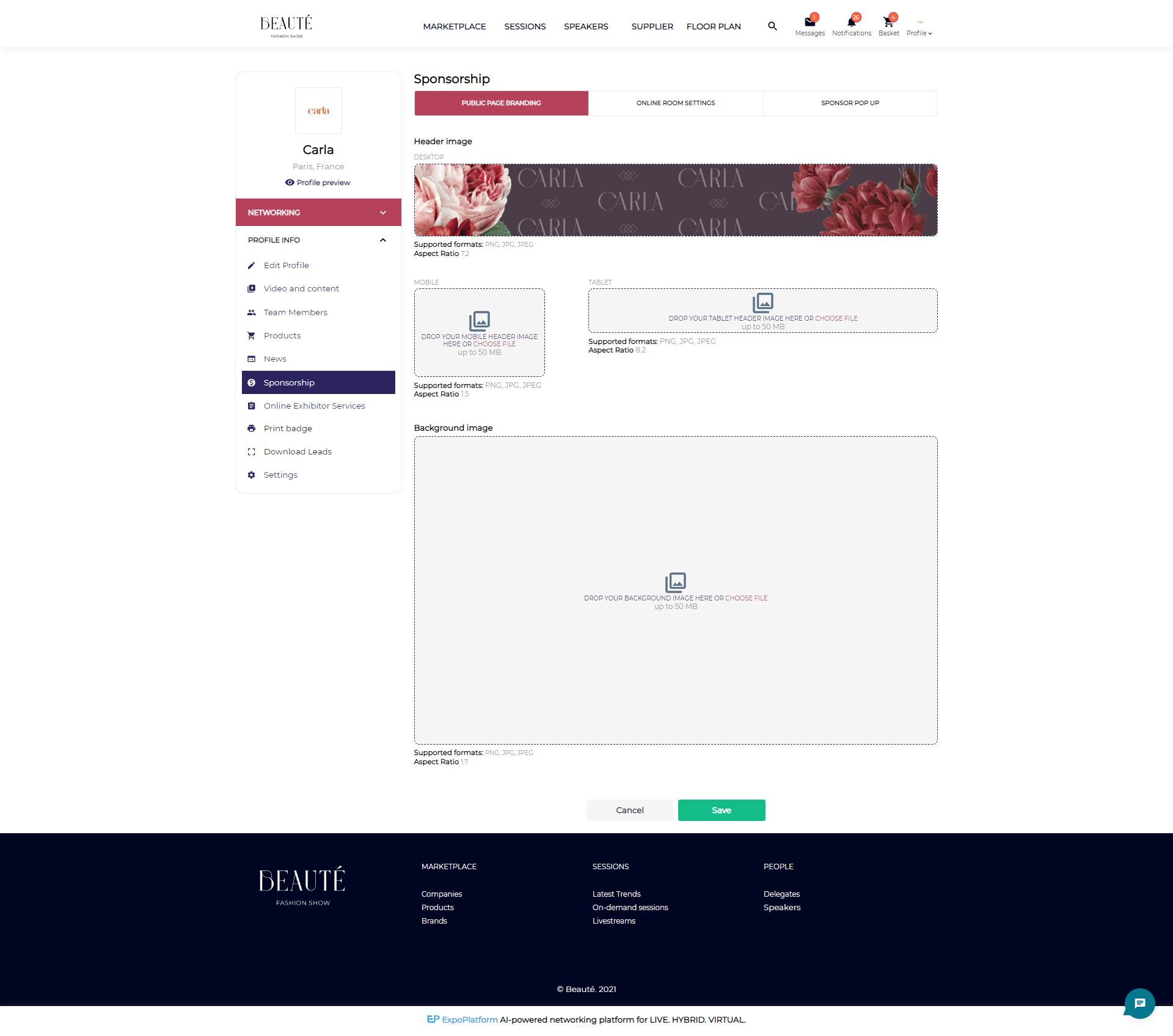i) Public Page Branding: This section allows the exhibitor to add header and background image for the profile on Expoplatform.