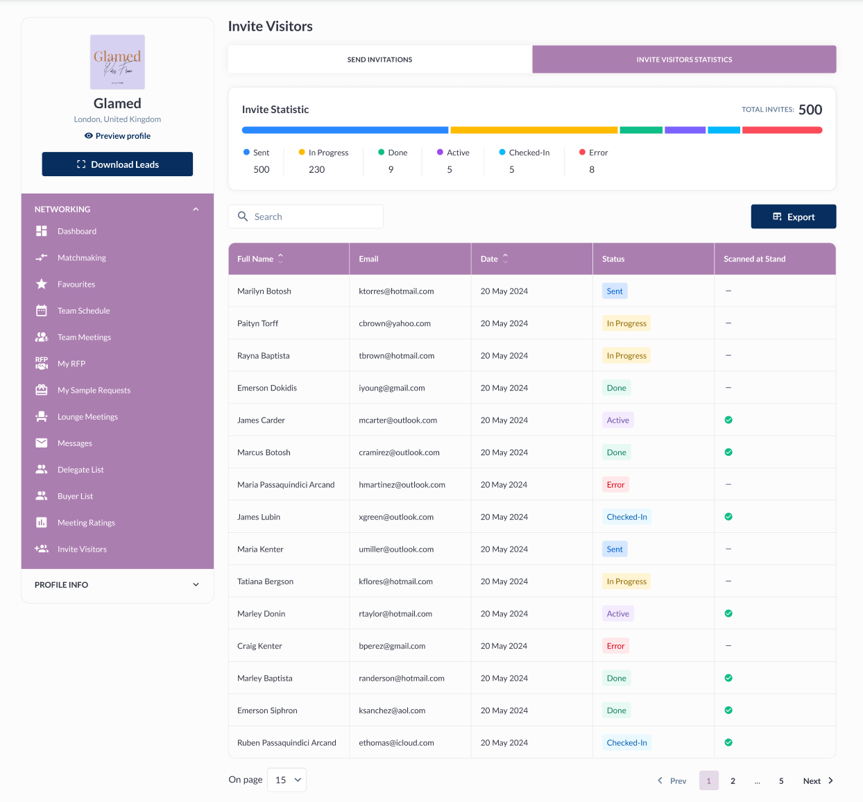 e. Scanned at Stand: Shows the details if the user badge is scanned by the exhibitor