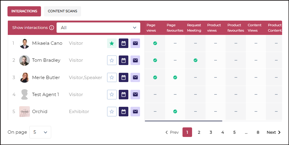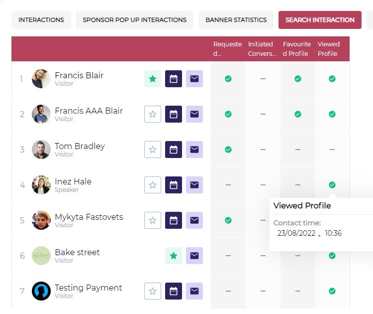 4. Search Interactions: This shows the statistics of the interactions when you are searching for an exhibitor, like interactions related to meetings, messages, favourite buttons or opening your profile, along with their respective date & time.