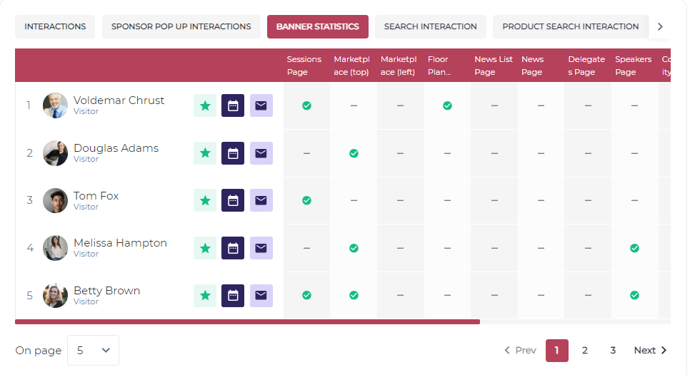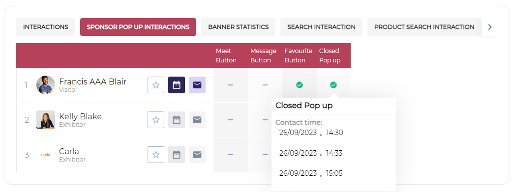 3. Popup Statistics: Shows the statistics/data of the user who clicked on meet, message, favourite & closed buttons, on the sponsor pop-up card on exhibitor along with their respective date & time of the interactions.