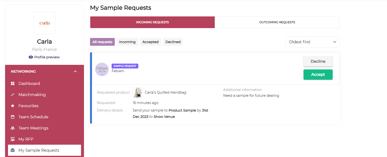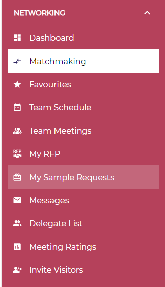 My Sample Request: This tab lists all the product sample requests made and received by the exhibitor.