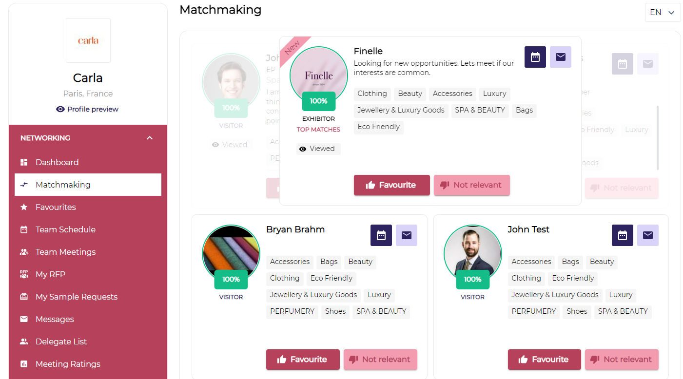 Matchmaking - By clicking on this an exhibitor can view potential matches. Matches are based on answers to the registration questions and user behaviour. For more information on matchmaking visit Matchmaking.