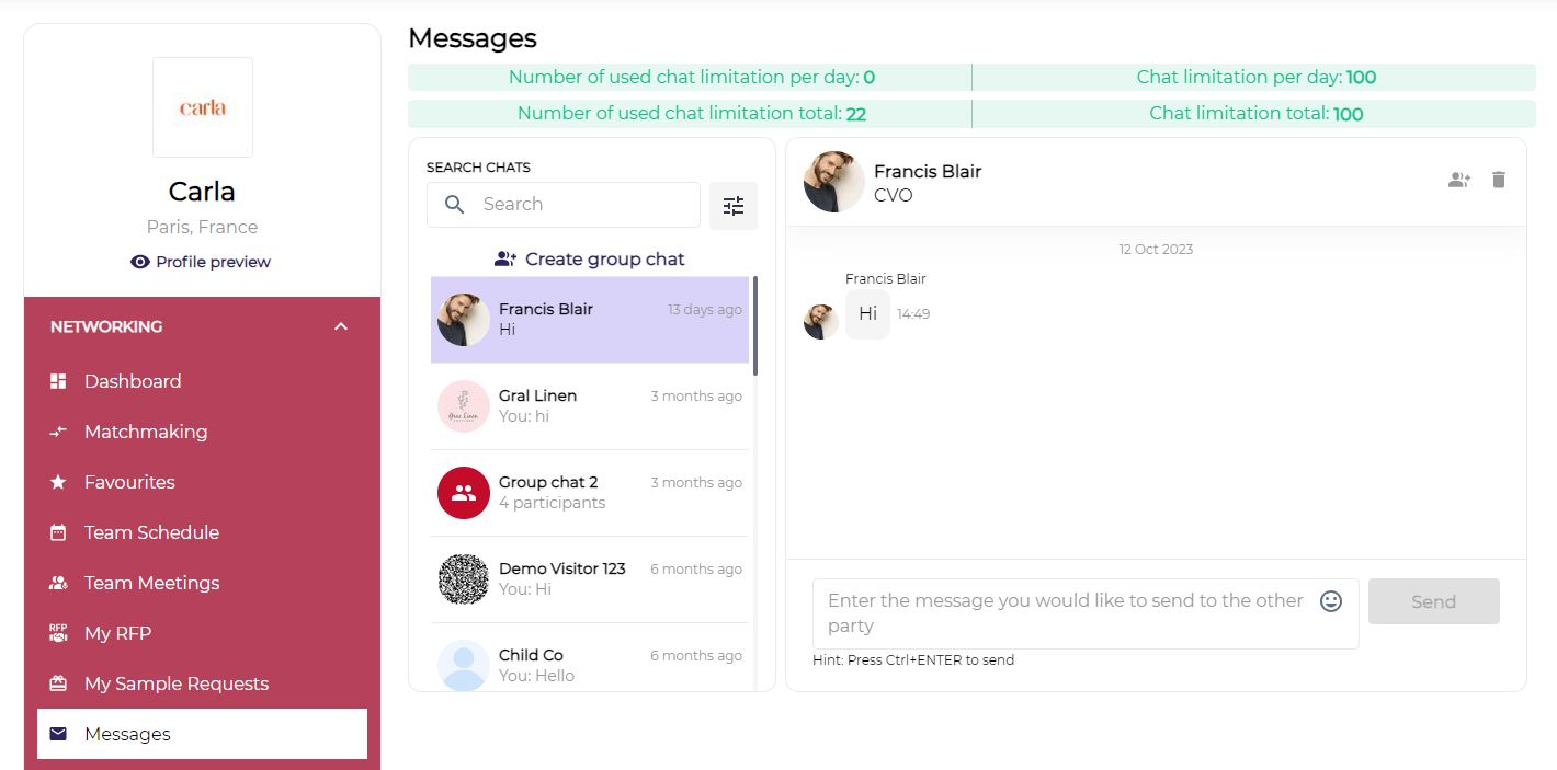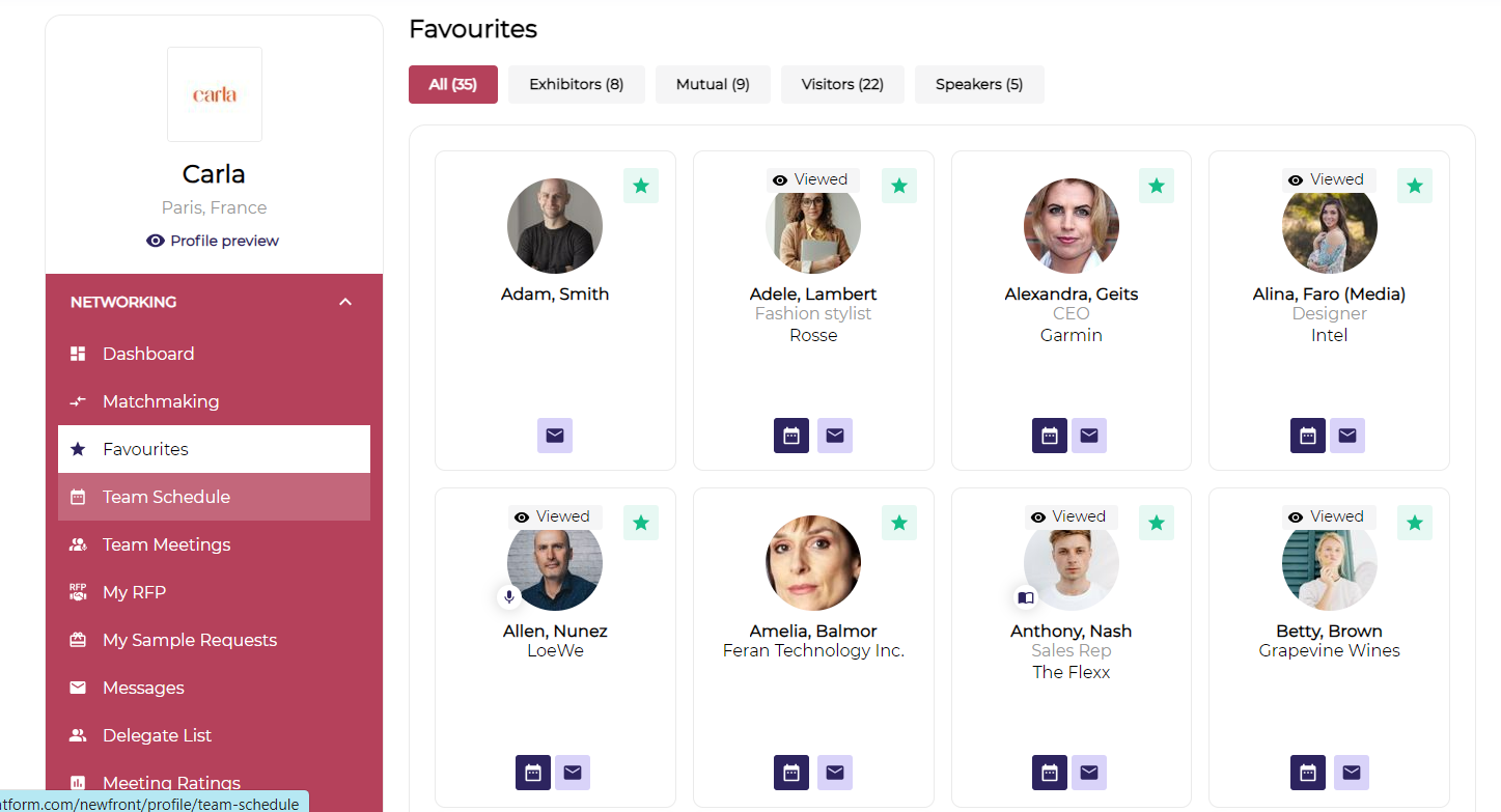 Favourites - This tab shows the list of all exhibitors, visitors, products and speakers that you have marked as a favourite.