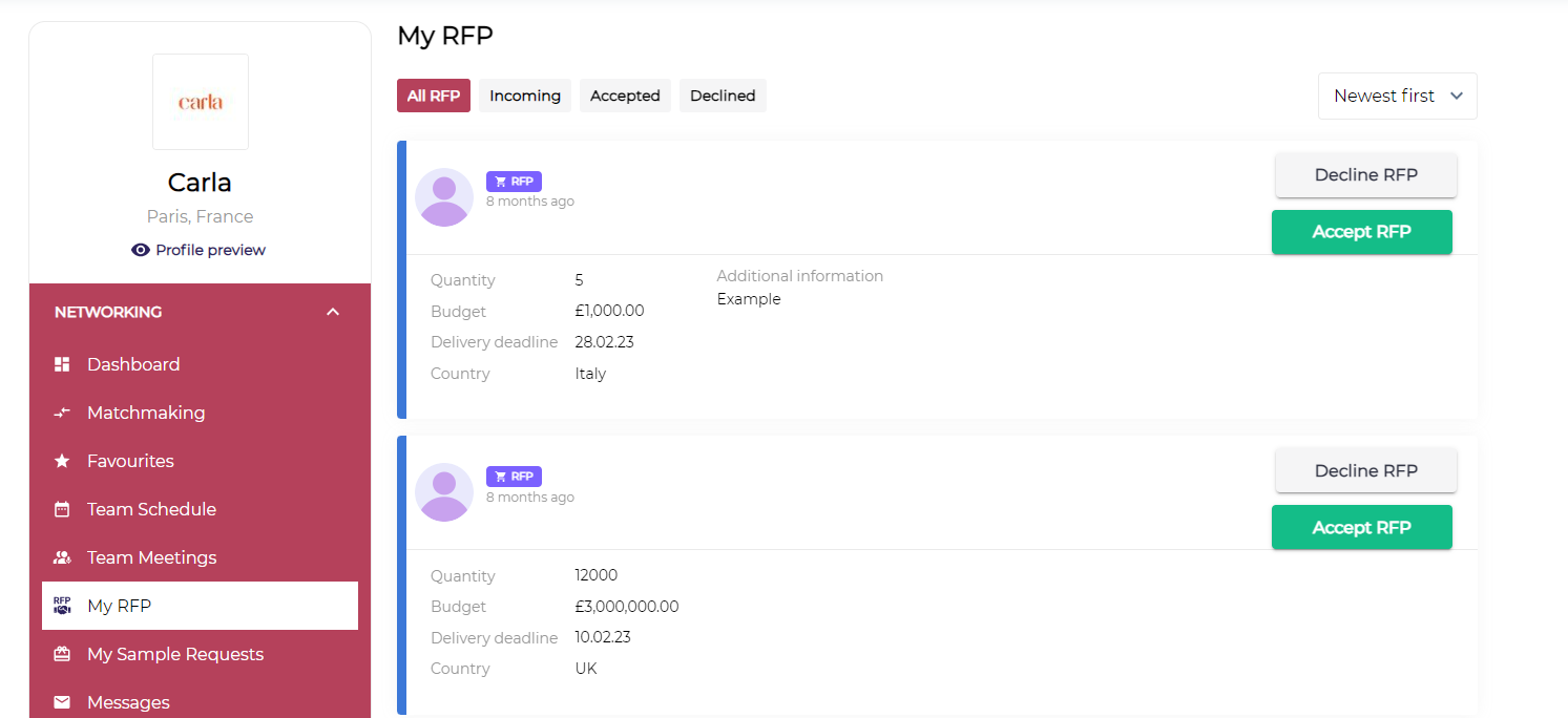 My RFP - This tab shows the list of RFPs submitted by participants along with the requestor, budget, quantity, and country of the requestor. You are able to decline or accept RFP. In case you’re going to decline a particular RFP, a popup appears, asking if you’re sure to decline it. In case of accepting RFP, you’re able to schedule a meeting or message a requestor.
