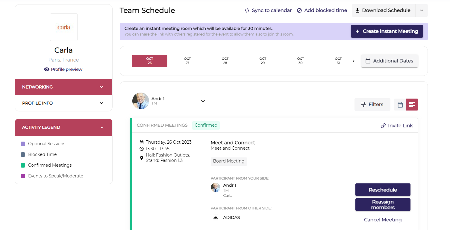 Team Schedule - View and manage the schedule of your "TEAM MEMBERS". Exhibitor can filter out their team member schedules based on advance filters and dates. Exhibitor can also download their team member schedule in XLS and pdf format by just clicking on the Download Schedule button.