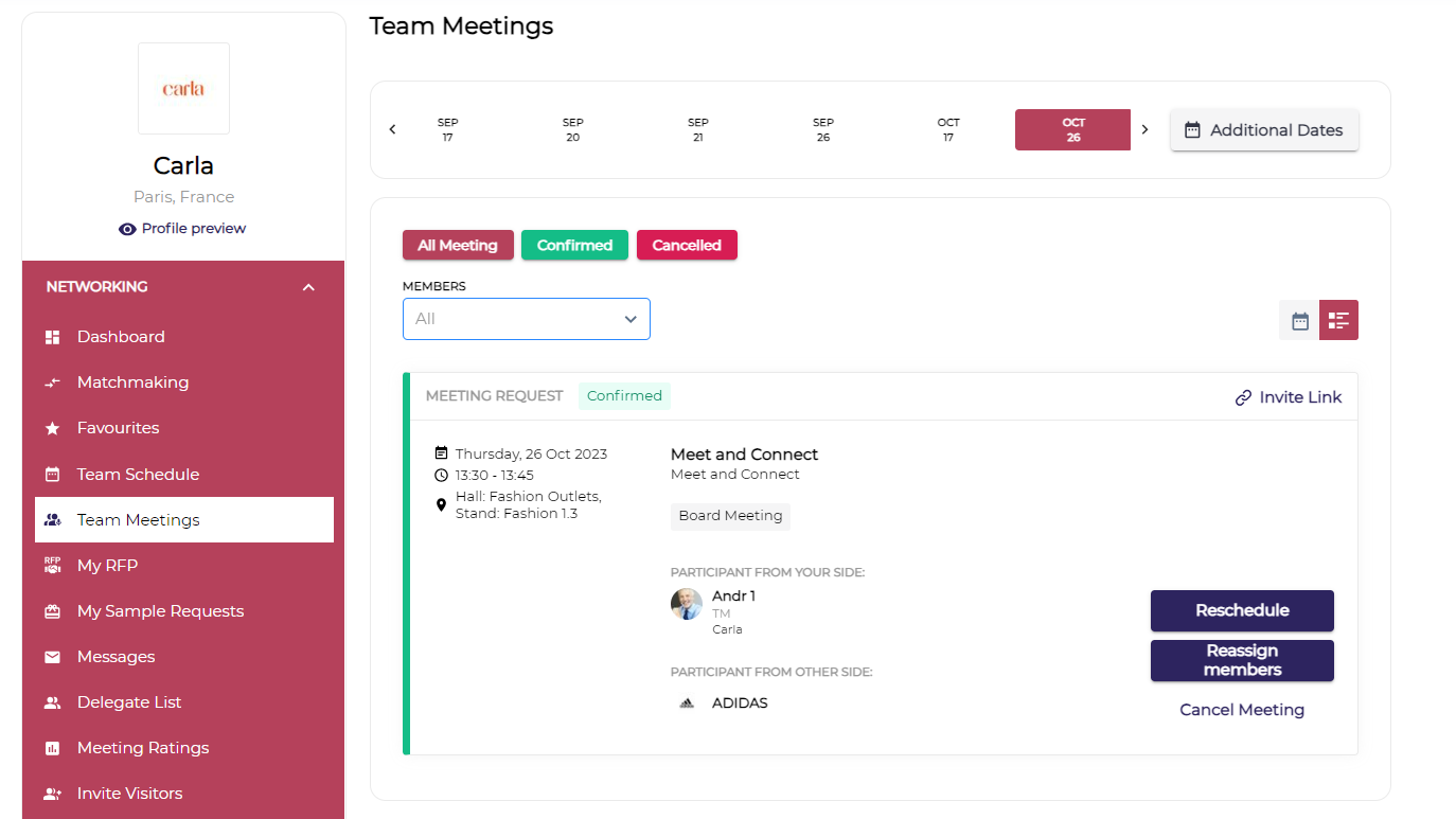 Team Meetings: This tab lists the details of the scheduled meeting for all the team members of the company. The exhibitor can filter out the details based on the date, team member and status of the meetings.