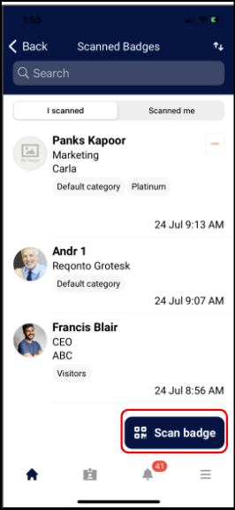 The app also includes a Scanned Me list, which displays the information of all the users who have scanned your badge.
