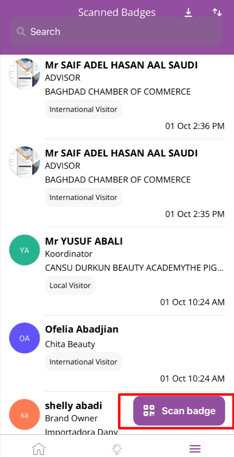 To scan the badge using a mobile app, navigate to the Scanned Badges option in the mobile app.