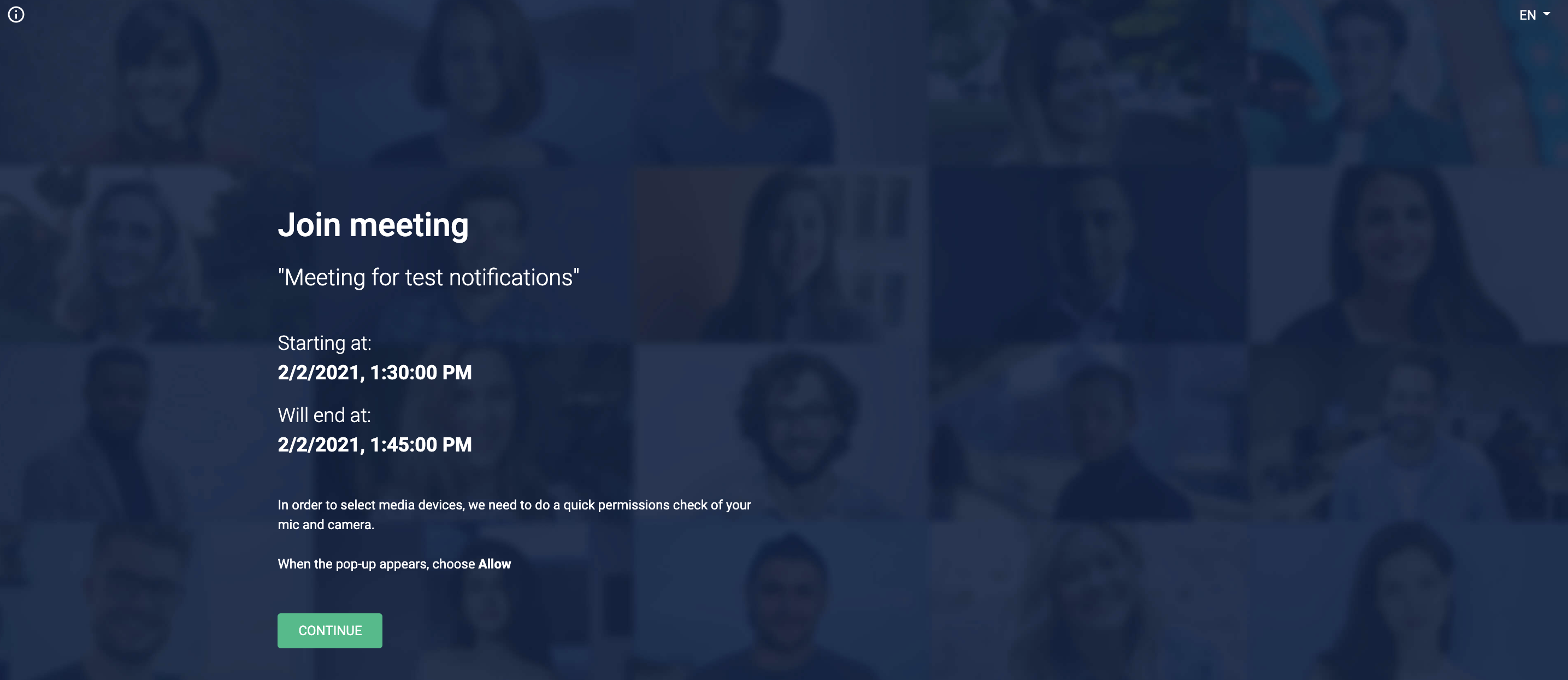 Once you've clicked the Join button from anywhere, you will be taken to the next screen for a quick permission check of your microphone and camera. You can click on the Ⓘ icon on the upper left corner of the screen to do a quick troubleshooting.