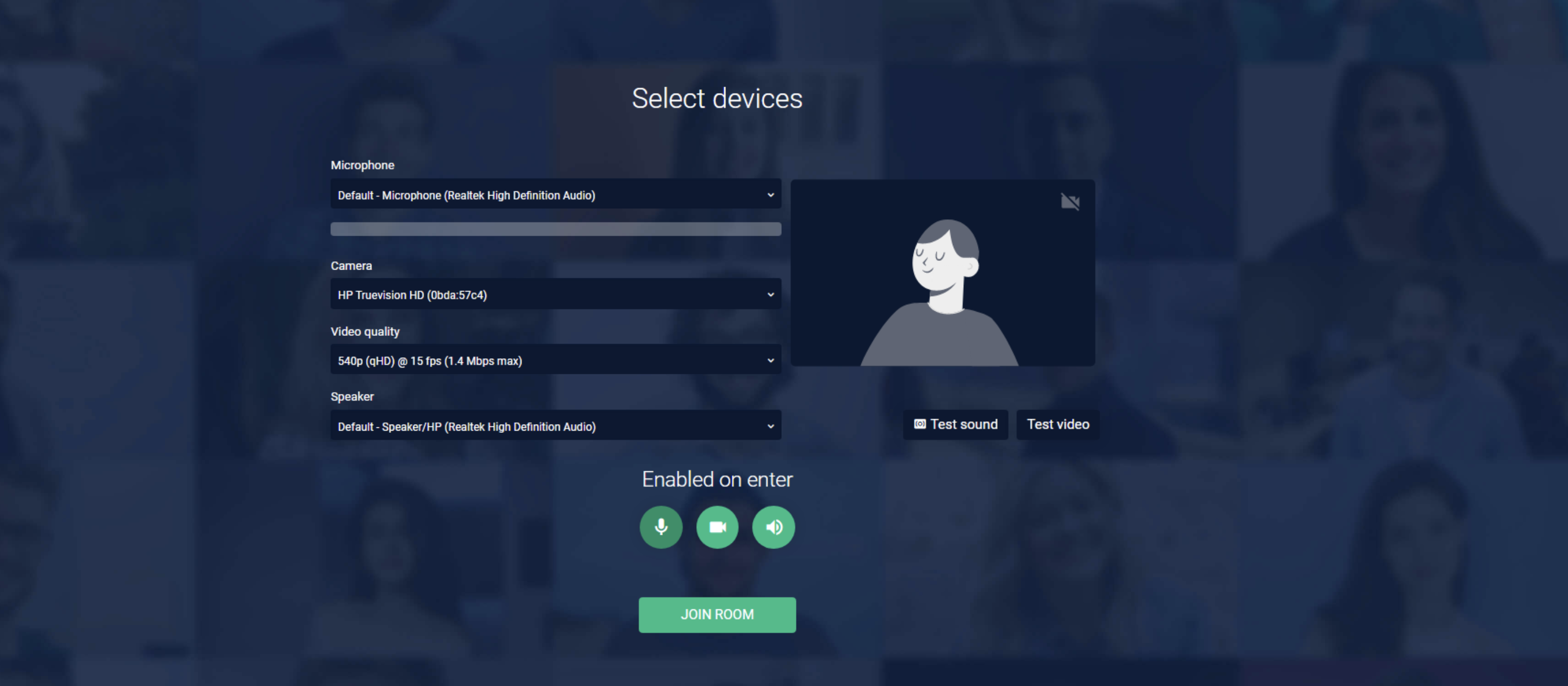 Next, you will see the staging screen where you can test your audio and video devices as shown below:
