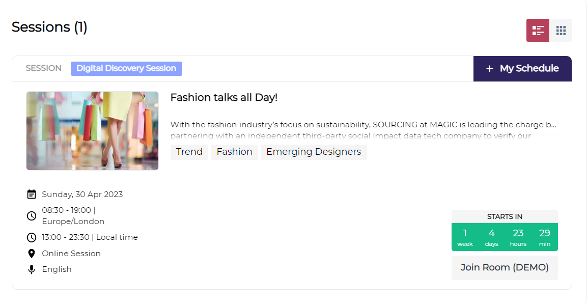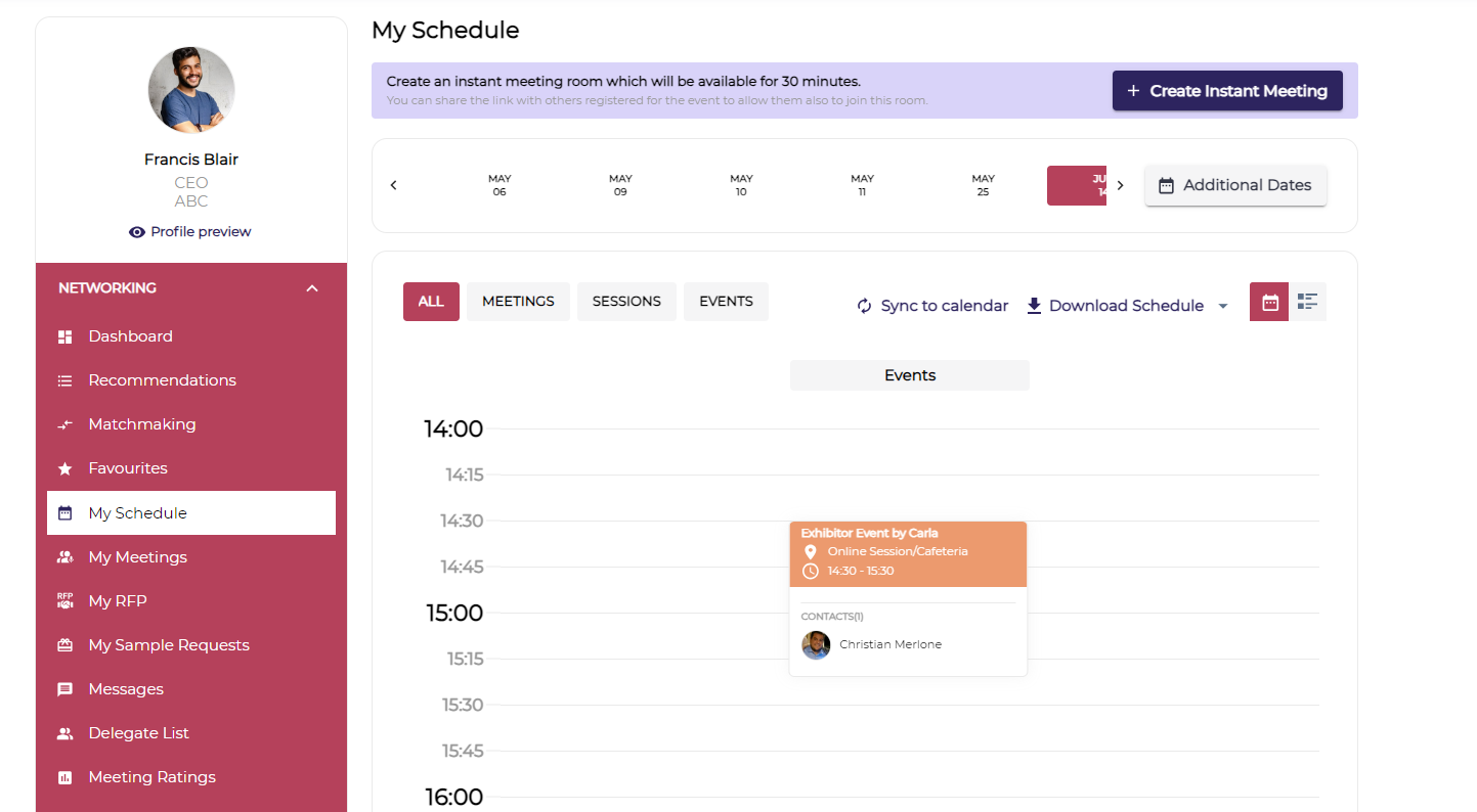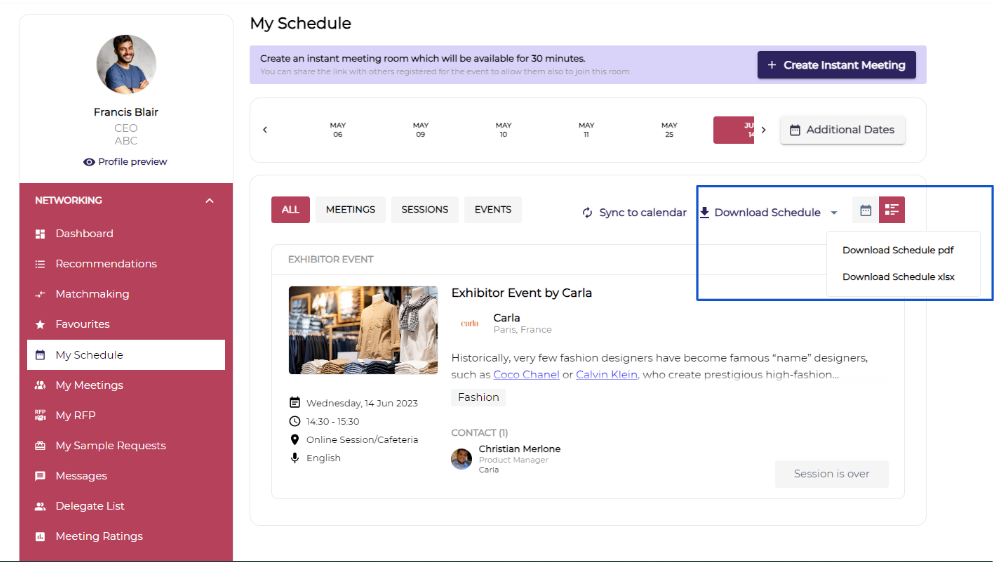 My schedule - This section allows users to view all their meetings and sessions scheduled during the entire event cycle.