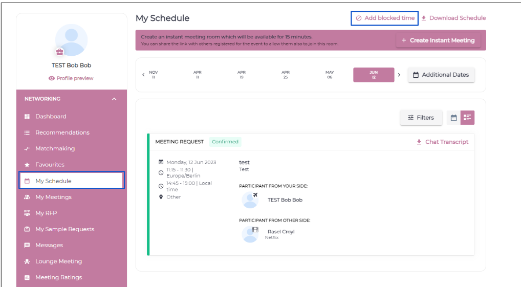 Under Networking → My Schedule → Add Block Time button, allows the user to block certain times for the day when they are not available for the meeting.
