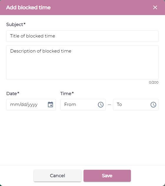 Users can add the Title, Description, Date and Time while adding block time to their schedule.