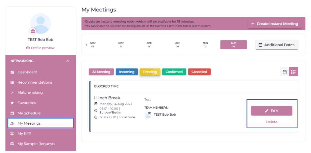 The user's blocked time details will be displayed under My Meeting and My Schedule tabs, from where they can Edit or Delete the details as needed.