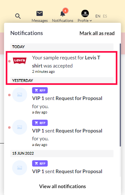 Once the product sample request is initiated the exhibitors will be notified through both an email and a system notification about the request received.