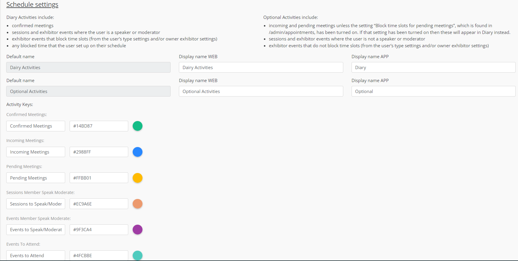 Pending and Incoming meetings will be placed in Diary activities, in case the setting in Admin panel-Networking&Matchmaking-Meeting “Block time slots for pending meetings” is applied.